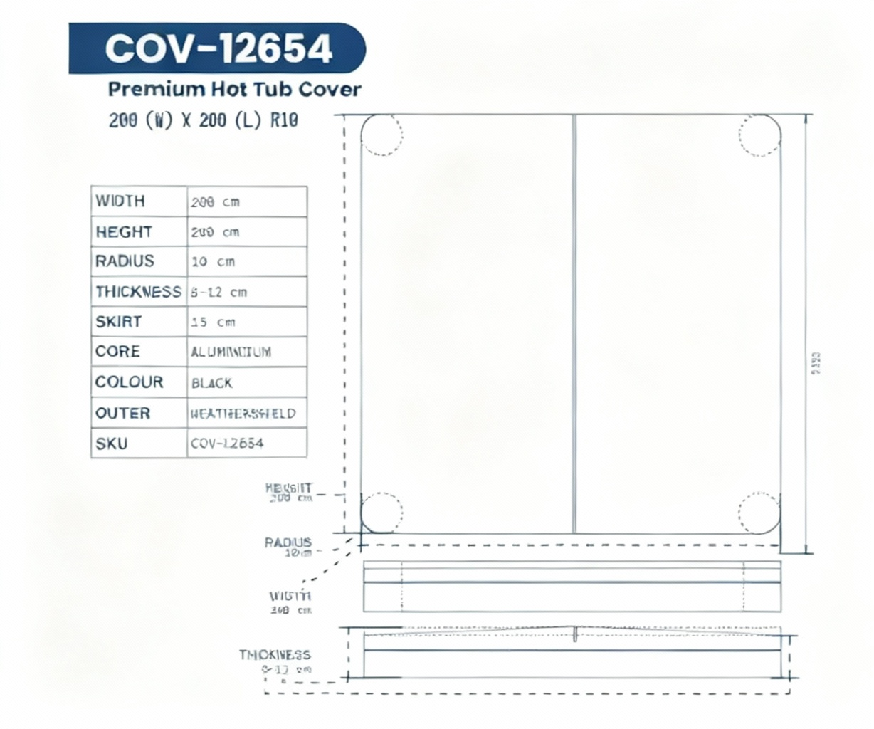A: This cover is designed for square spas measuring 200 cm x 200 cm with 10 cm corner radius.